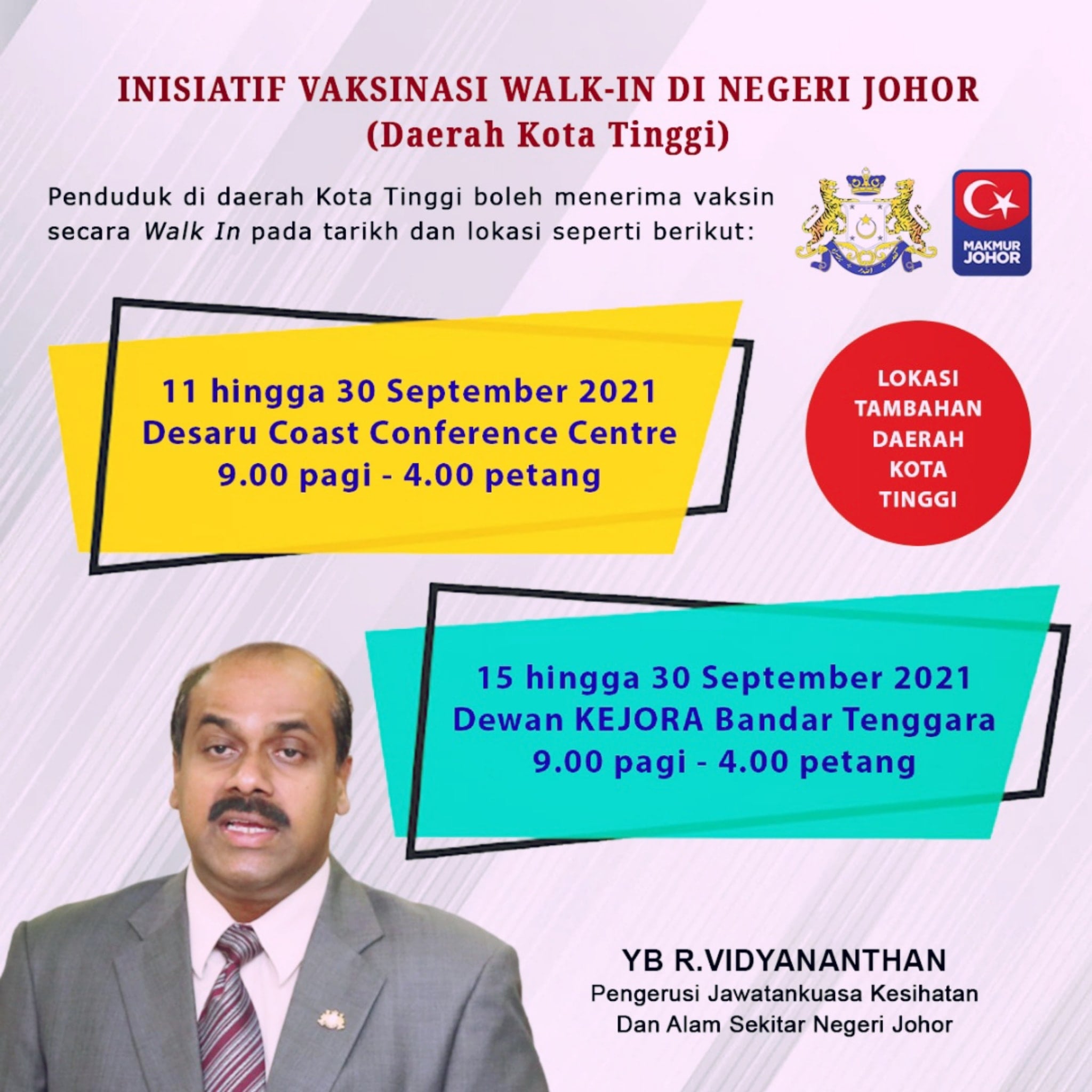柔佛州卫生及环境委员会主席阿威雅今日在脸书发布上述消息,哥打丁宜县的居民可直接登门到上述2个疫苗接种中心接种疫苗。