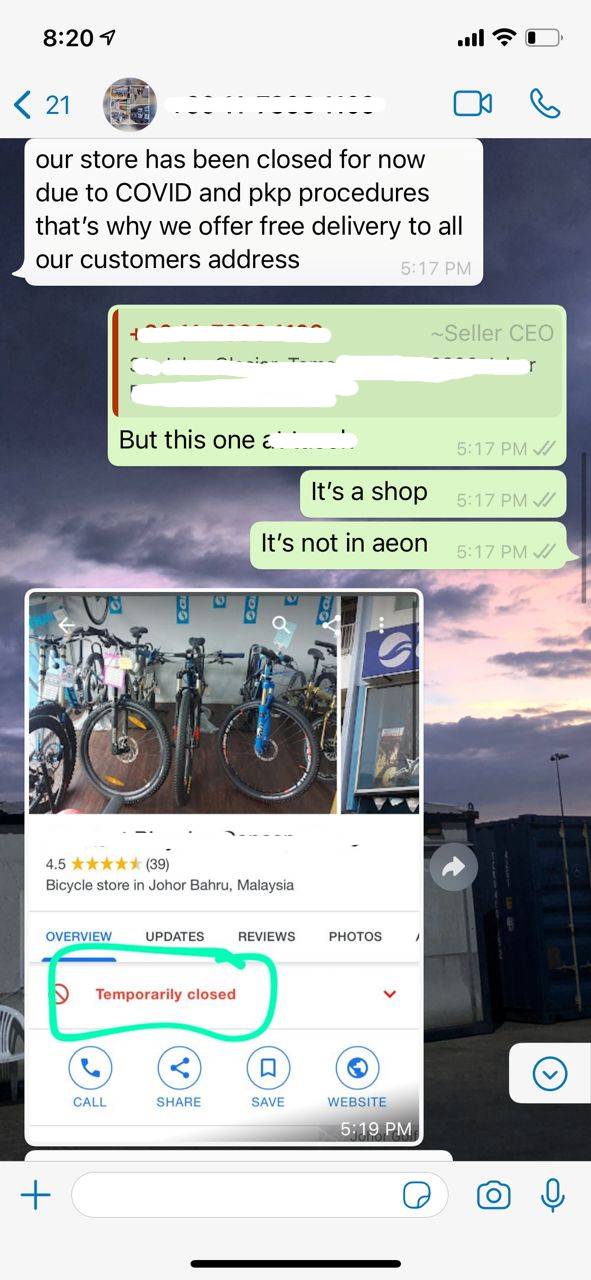 她表示,该名消费者是在某购物平台看中一辆售价278令吉的折叠式脚踏车,询问是否可以上门自取脚踏车。不过该名“卖家”然后绕过平台的聊天系统,私下通过WhatsApp联络顾客,谎称因为必须遵守行管令SOP,只提供送货服务。