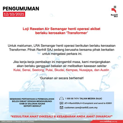 柔佛联熹水务公司(Ranhill SAJ)官方脸书发表贴文作出这项宣布,并指出由于维修工作耗时,该公司预计以下地区的水供将受影响,包括古来、士乃、泗隆、埔来、士姑来、甘拔士、努沙再也、奥斯丁。