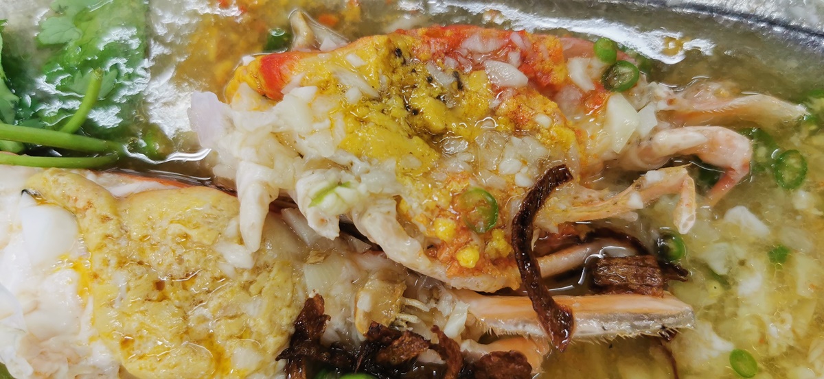 还好来的这道煎得外皮焦香脆,虾肉软嫩有味。第二吃蒸虾头,虾膏触目警心,吃了两口停下。蒸虾汤汁姜蒜交错,爽辣滚烫,专心呷汁,中午努力储蓄下来的酒意,就这么抵消了。
