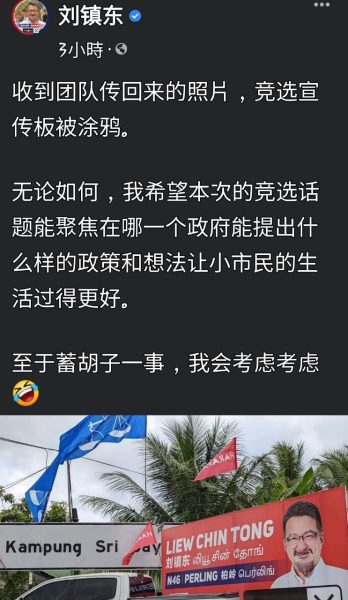 刘镇东的贴文写著:收到团队传回来的照片,竞选宣传板被涂鸦。无论如何,我希望本次的竞选话题能聚焦在哪一个政府能提出什么样的政策和想法让小市民的生活过得更好。