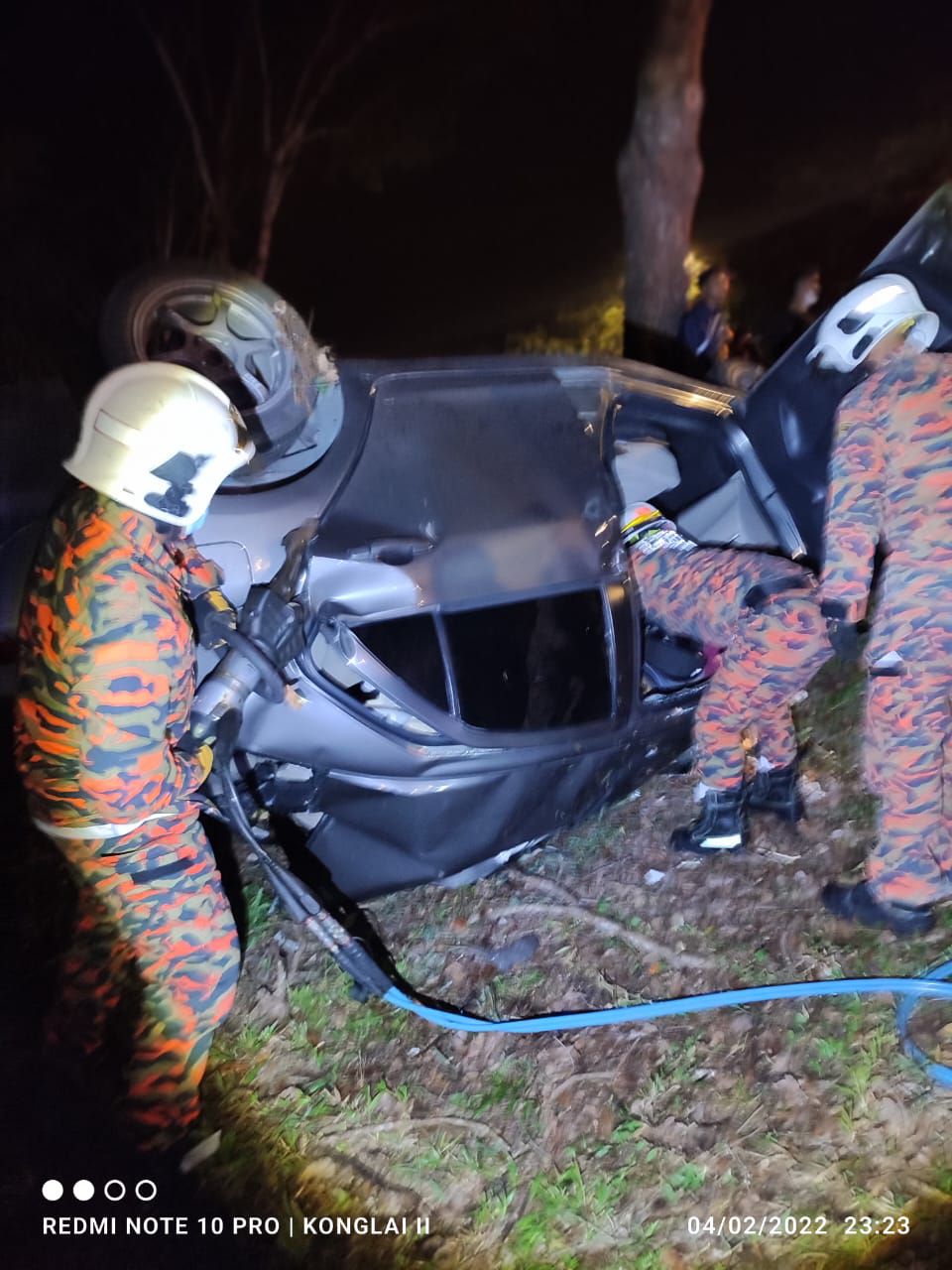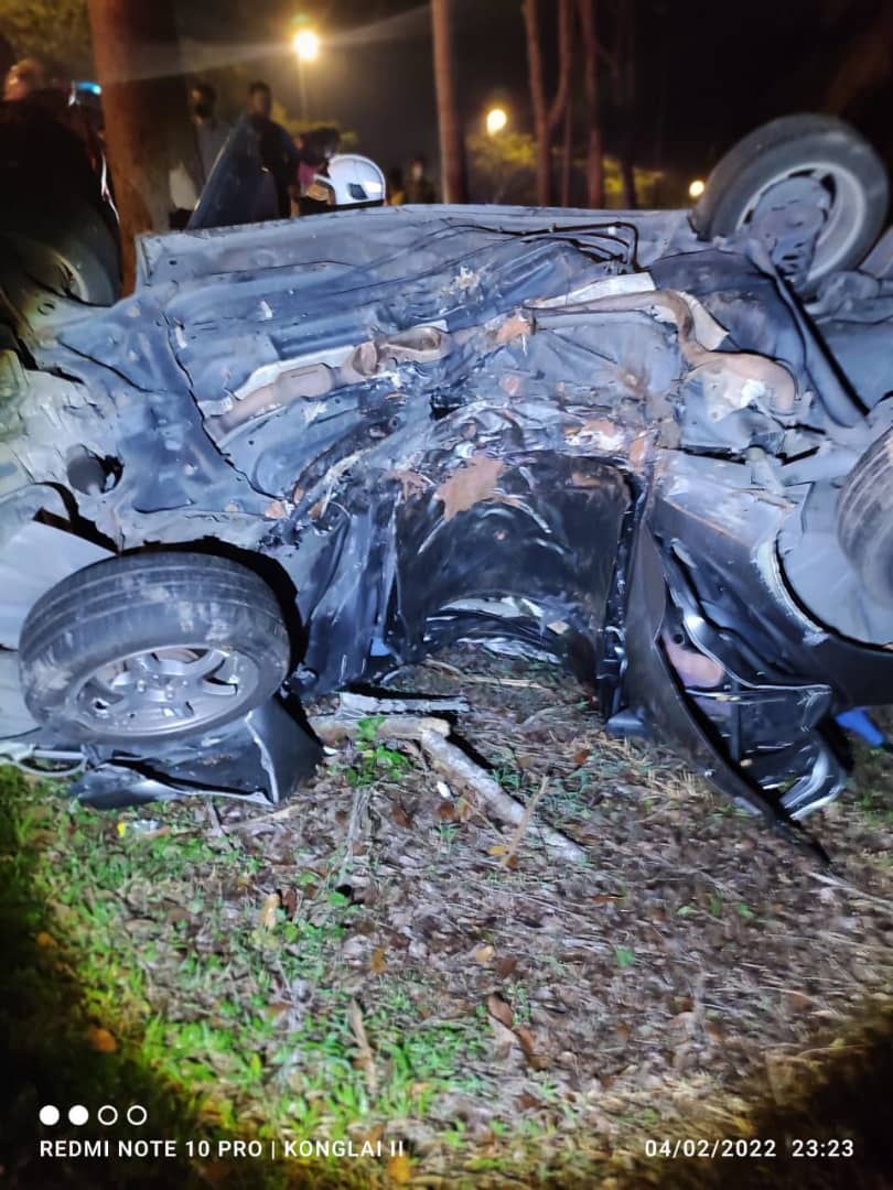 (居銮3日讯)一辆行驶中的轿车失控撞树,车身严重损毁,两名男女命丧当场。