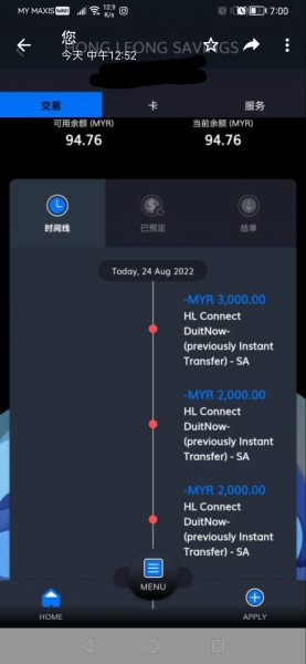 男子上传银行转账记录截图显示,不法分子将其存款分成三次转账,让他损失了7000令吉,如今其银行户头只剩下94令吉76仙。