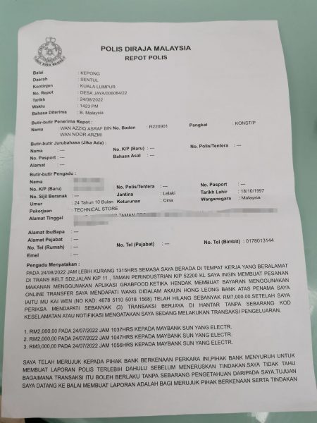 26岁华裔男子本周四(25日)在脸书发文,申诉自己在没下载任何不明手机应用程序、没接听陌生电话、没点击不明链接的情况下,银行户头里的存款惨被盗取,让他愤怒不已报警处理。