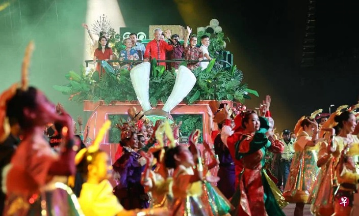 首场妆艺大游行的嘉宾是总理李显龙与夫人何晶,他们与文化、社区及青年部长兼律政部第二部长、人民协会副主席唐振辉一起乘坐华丽花车入场,还以华语和英语向观众献上新年祝福。