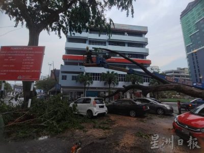 (新山9日讯)午后一场雷电交加的大风大雨,导致新山市区多条路段,如亚逸摩力路(Jalan Ayer Molek)和陈旭年文化街一带遭受暴风雨袭击,树倒压车、文化街牌匾和停车场工程铝制围墙倒塌、天台铝制框和冷气压缩机倒塌,所幸没有接获伤及商民投报。