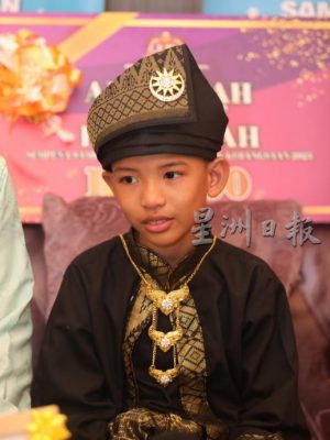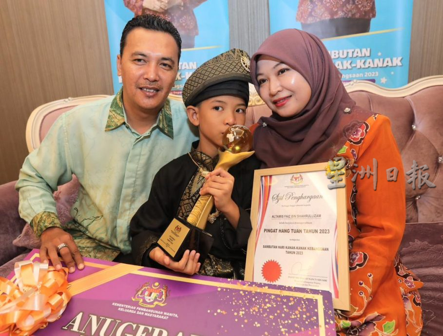 来自瓜拉雪兰莪的阿尔塔密斯于今早在父亲依兹林(45岁)和母亲法姿琳(39岁)陪同下,在“儿童日”庆祝活动上,从妇女、家庭及社会发展部长拿督斯里南茜苏克利手中接领奖杯及5000令吉奖金。