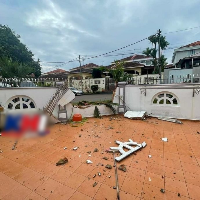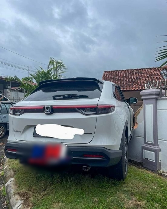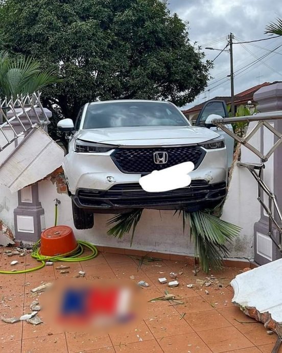 (居銮17日讯)准备右转时被突现的摩托车惊吓到,37岁华裔司机误踩油门直撞破住家围墙,最终整辆汽车挂在围墙上。