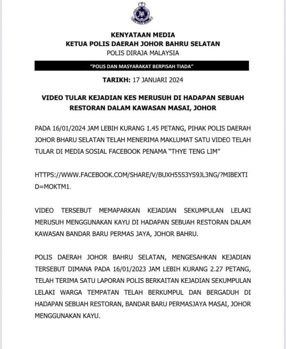 拉勿透露,新山南区警区总部于前日(1月16日)下午1时45分发现上述视频在脸书疯传。