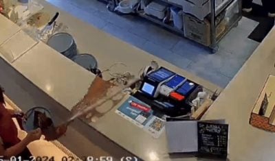 发言人说,监控器拍到,当时站在服务柜台前的女子一把夺过蛋糕,在她前面的顾客离开、烘焙师背对着她时,把热可可洒得满柜台都是,波及柜台的销售点终端(Point-of-Sale,简称POS)设备。