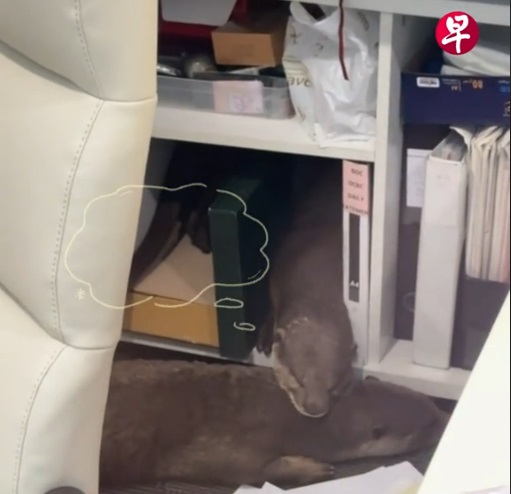 被关在闭密空间的水獭似乎受到惊吓,“大发脾气”一下爬上办公桌探头,一下钻进柜子里和同伴歇下,将办公室搞得一团乱。大量文件散落一地,还有名牌包、滑鼠、鞋子等四处散落,放在桌上的电脑和文件都无一幸免,其中部分文件也沾有排泄物。