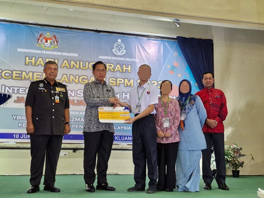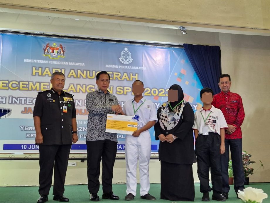 颁奖者及陪同颁奖者分别是教育总监阿兹曼、大马监狱局(安全及惩教)副总监拿督阿都阿兹、日间学校管理组主任拿督阿都目依。