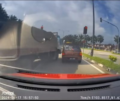 根据有关行车记录器视频显示,当车主在交通灯转红时,与前方慢速道及快速道两辆汽车停车等候之际,下一秒突然出现一辆罗里从慢速道驶前,在左右两辆车之间夹缝中直闯红灯,行驶时车身还擦撞停在右侧快速道的红色汽车,以及左侧慢速道的白色汽车,再转换车道至左边慢速道。