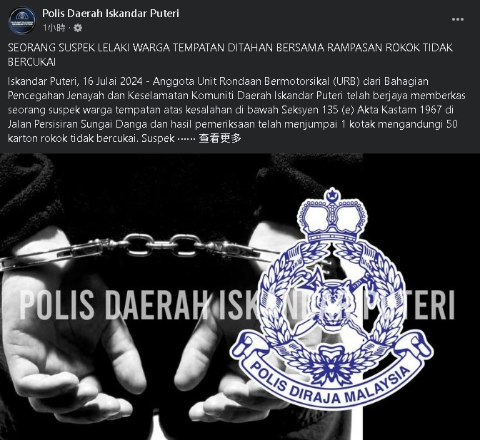 警方援引1961年统制品法令第21条文(蓄意收藏统制品)将嫌犯带往依城警局做进一步调查,同时呼吁民众若有任何犯罪、毒品或相关的情报,可前往附近的警局或联系依斯干达公主城控制中心(07-511 3622)或拨热线(07-511 4486)提供情报。