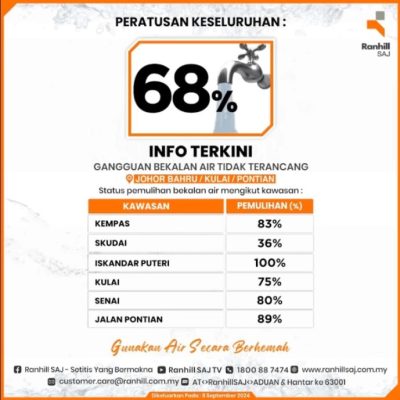 (新山9日讯)柔佛水务联熹有限公司(SAJ Ranhill)指出,截至今早,因士芒加滤水站电力供应不稳定而导致的制水地区已有68%的水供恢复正常。