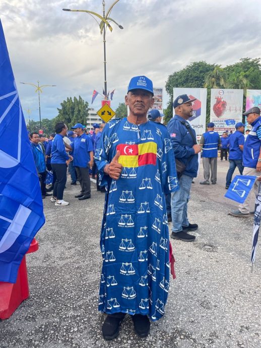 巫統支持者阿里亞斯穿著為此次補選特別自製的國陣旗幟服飾到場支持,他也曾在能吉里補選時以另一套黨旗服登場。