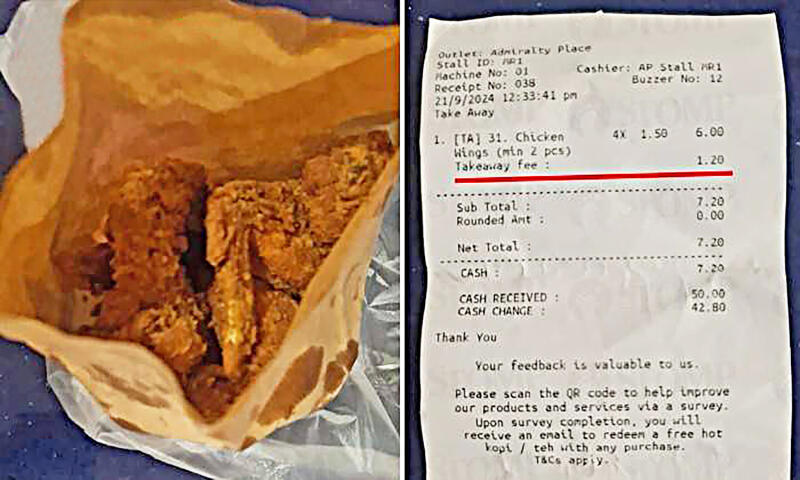 《新明日报》报道,日前有网民发文,指自己上周六(21日)中午到海军部坊(Admiralty Place)邻里购物中心的Cantine食阁,在一个西餐摊打包了4只炸鸡翅膀,结果被收取1元2角的打包费。