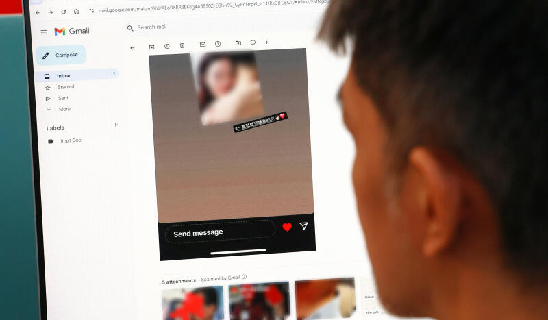 爆料电邮还附上两人的聊天记录和亲密合照,其中一张社媒动态截图显示两个人抱在一起,下面写着“一直默默守护我的你”,也加入了爱心符号和“谢谢”字样的贴纸。
