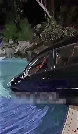 脸书专页之前上载视频,则显示被告的轿车冲入乡村俱乐部的游泳池。根据画面,黑色轿车的车头已陷入游泳池内,车表面也有明显的划痕。司机座位的车门当时打开,但是并没有看到被告的踪影,引起网民热议。