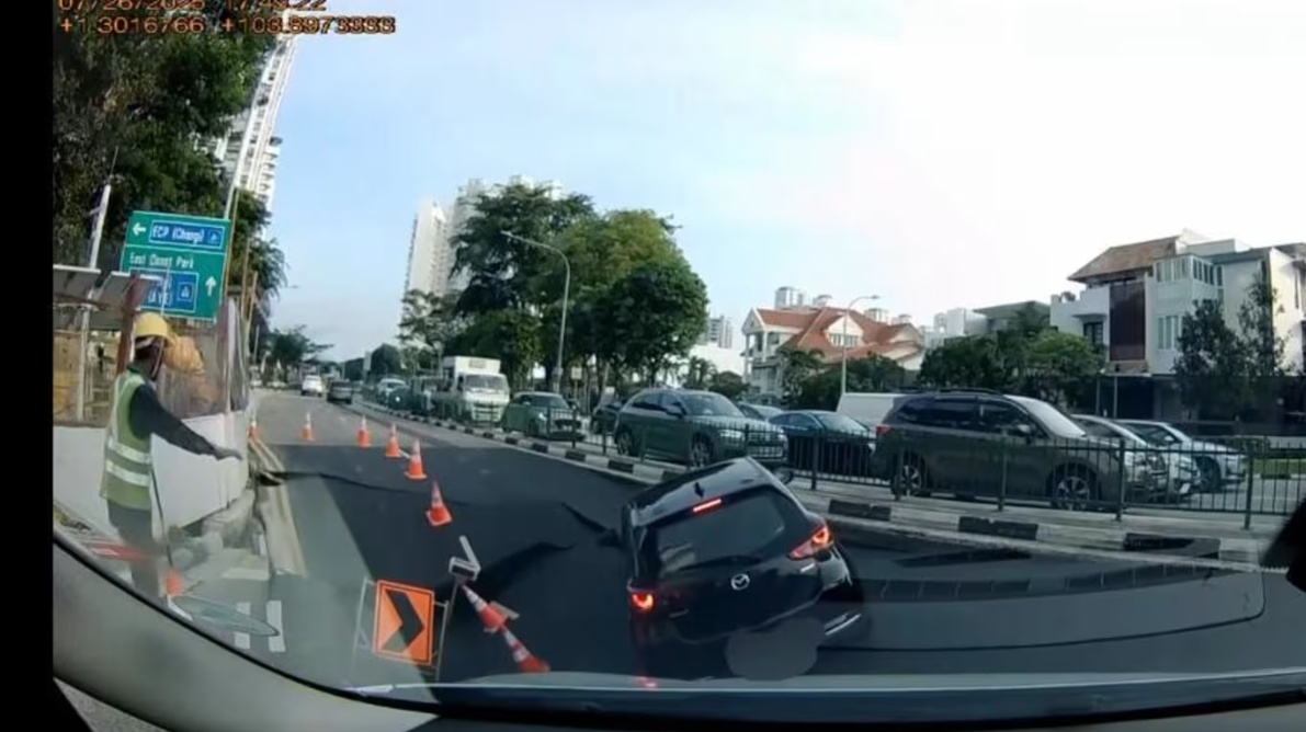 (新加坡27日讯)女司机在丹戎加东南路发生路面塌陷后连人带车坠入坑洞的惊险画面曝光。视频显示,她驾驶的车辆刚从分叉路开进丹戎加东南路后,路面突然塌陷,车子跟着坠入坑内,跟在后面的车辆及时停车逃过一劫,惊险万分。