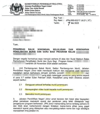 《星洲日报》接获读者来函,指该名舞狮教练遭家长举报和报警备案,惟尚未受到执法及司法制裁,其父亲则到处“封口盖案”,以致家长深感恐惧和无助,希望警方正视和彻查,避免下一位受害者在沉默中受伤害。
