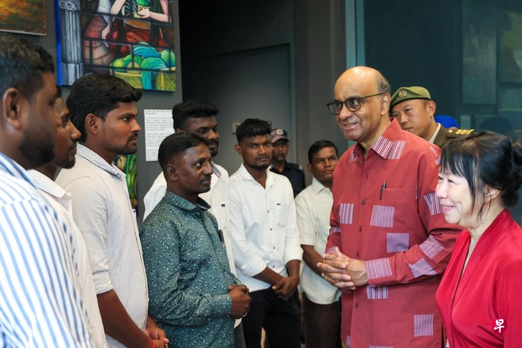 (新加坡3日讯)日前在马路塌陷事故中救人的客工,今日受邀在配合新加坡国庆的开放日参观总统府,尚达曼和夫人珍一藤木当面向这些见义勇为的客工表达了感谢。