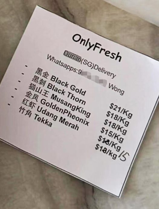 根据苦主提供的照片,对方发来的宣传单,列明了各种名种榴梿的价格,其中黑金是每公斤21元(约69令吉)、黑刺和猫山王18元(约59令吉);金凤、红虾和竹角价格为每公斤15元(约50令吉)。
