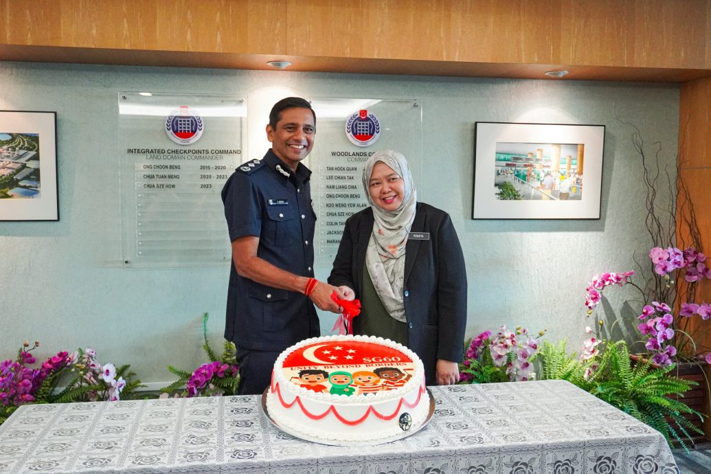 配合新加坡建国60周年,边境管制与保护机构代表团还特别送上蛋糕。