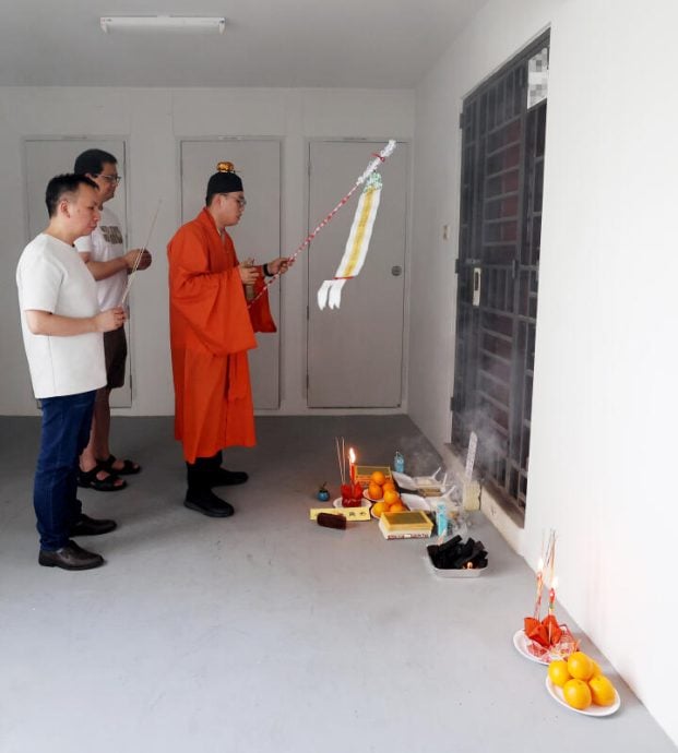 (新加坡11日讯)徐娜的国大同窗找法师上门进行招魂仪式。这场法事是与昨天下午约5时进行,两名昔日同窗莫先生及宋先生都前来祭拜。莫先生指出,他此前有询问过徐娜在法国的同事,但无法确定她的宗教信仰,于是他就按照新加坡的华人传统,为徐娜父女进行招魂。