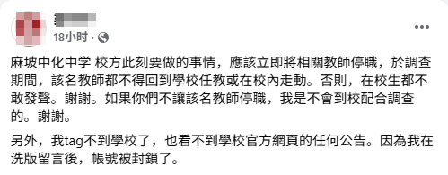 另一方面,目前已有学生与校友发起联署活动,表明支持该教师,并呼吁相关方尽快展开公正调查。