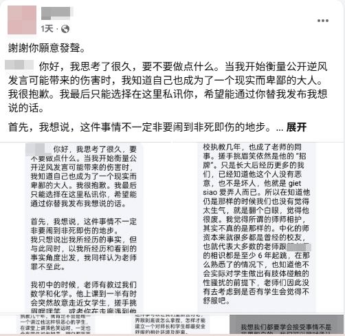 她说,也有学生私信她指出,该教师过去曾对女生有言语不当的行为,但在被校方警告后已有所改善,并强调该教师在学生遭遇外界性骚扰时会立即挺身而出。