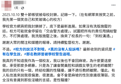 他们也表示,他们愿以学生与校友身份证明该教师在教学中的专业与尊重,强调自己从未在相处中感受到任何侮辱或不当行为,希望社会大众给予该教师公正的发声空间。