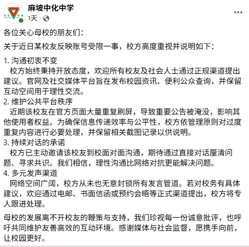 针对屏蔽“L”的账号一事,校方昨日发布文告解释,由于“L”在学校的官方页面多次张贴相同内容,导致重要公告被淹没,影响其他使用者权益,为维护公共平台秩序,校方对过度重复的留言进行必要处理,并保留相关截图以供说明。