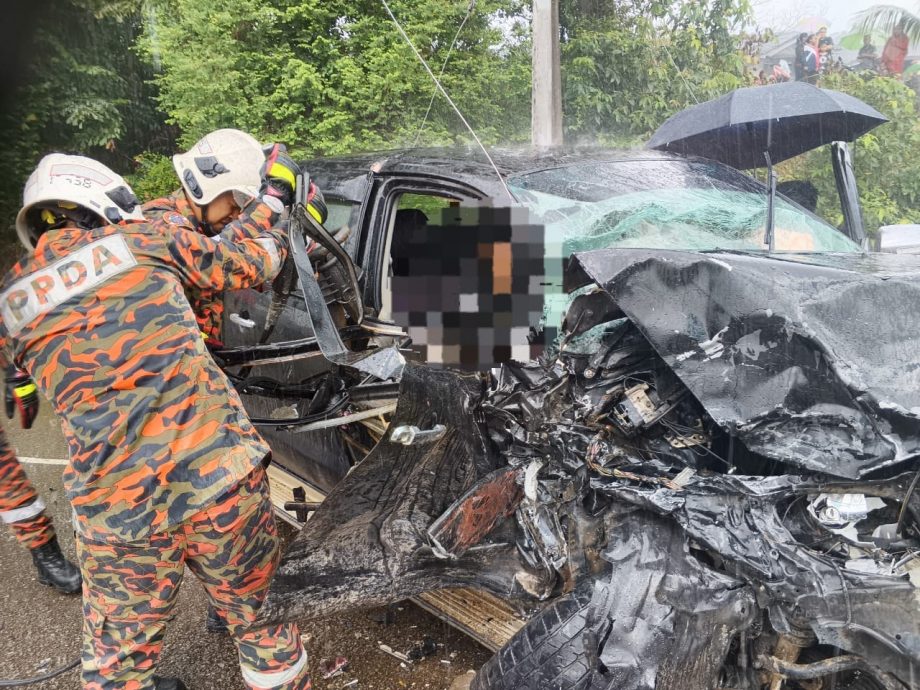 (居銮14日讯)居銮哥打丁宜路今午发生3车连环相撞事故,一名男子被困在汽车内,由消拯员冒雨救出后送院治疗。