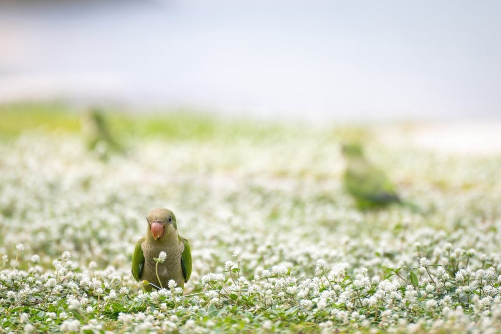 (新加坡25日讯)白色花田间,绿色鹦鹉蹦跳觅食的画面让网民惊叹“太漂亮了”!室内设计师日前在新加坡东部一处草地偶遇多只和尚鹦鹉,并将这十分疗愈的画面发到网上,引发热烈回应。