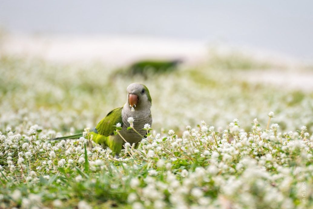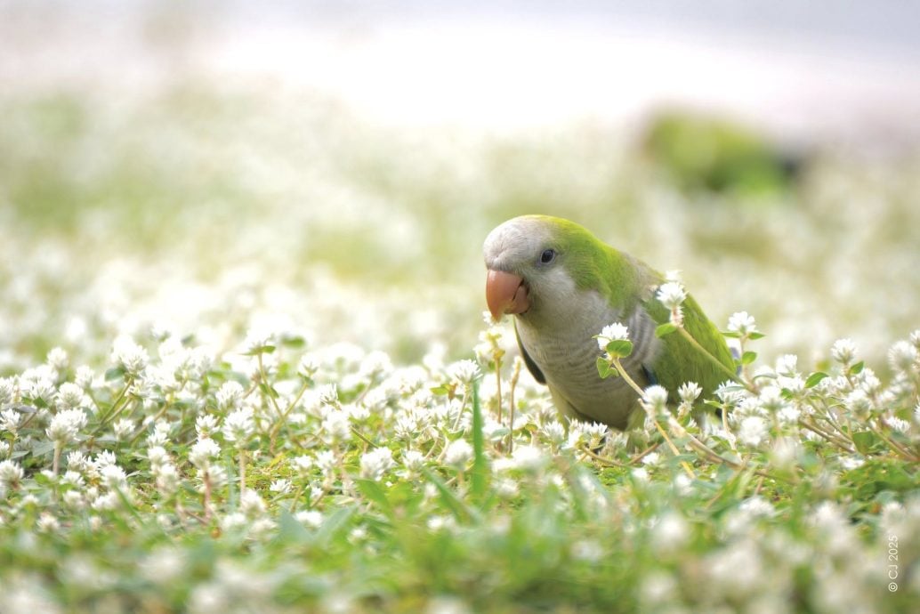 也是摄影爱好者的他,在脸书专页(Singapore Wildlife Sightings)上分享了自己在一片白色花田中,和尚鹦鹉(Monk Parakeet)蹦跳觅食的画面与视频。不少网民表示惊叹,纷纷评论“太漂亮了”“好可爱”等。