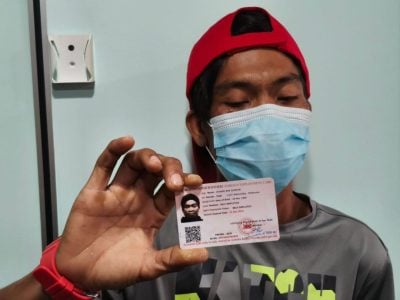 祖出示自己刚抵达柬埔寨时制作的工作证,并表示自己原本体重为54公斤,5个月内减少了12公斤,形象大相径庭。(张柔生摄)