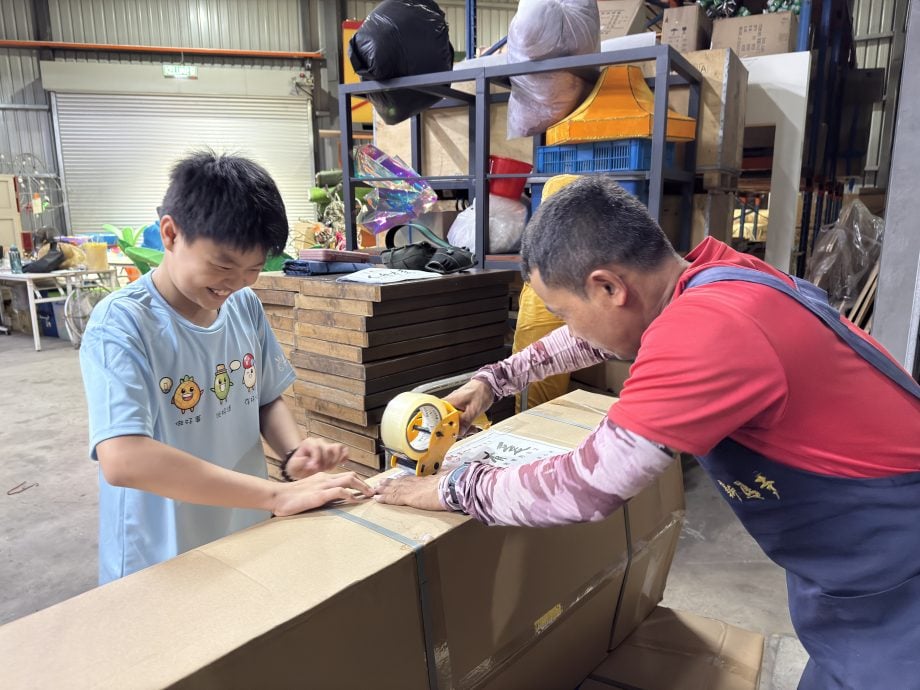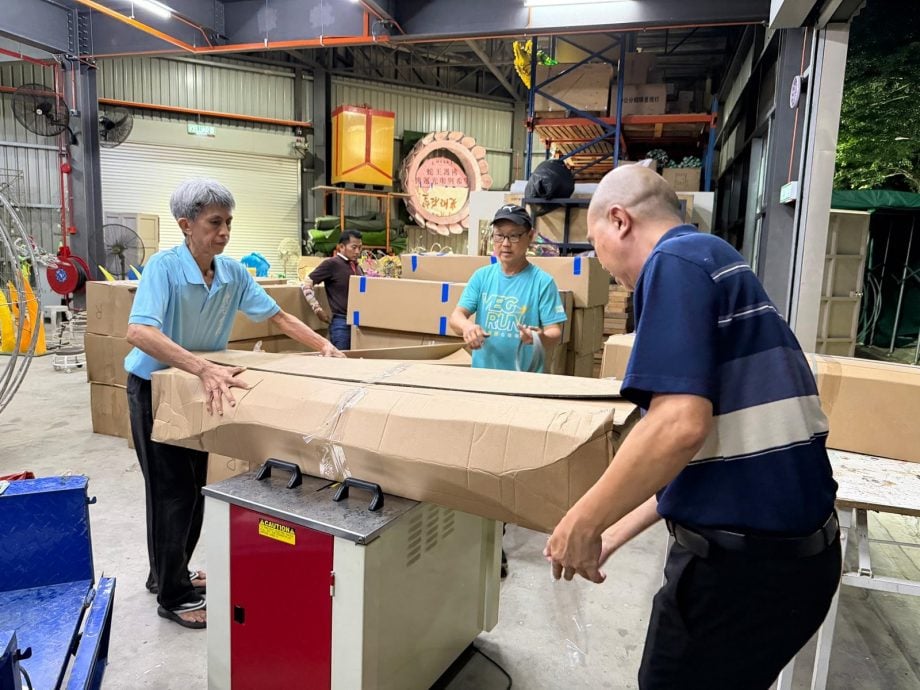 大小义工齐手连夜准备救灾物资。(新马寺提供)