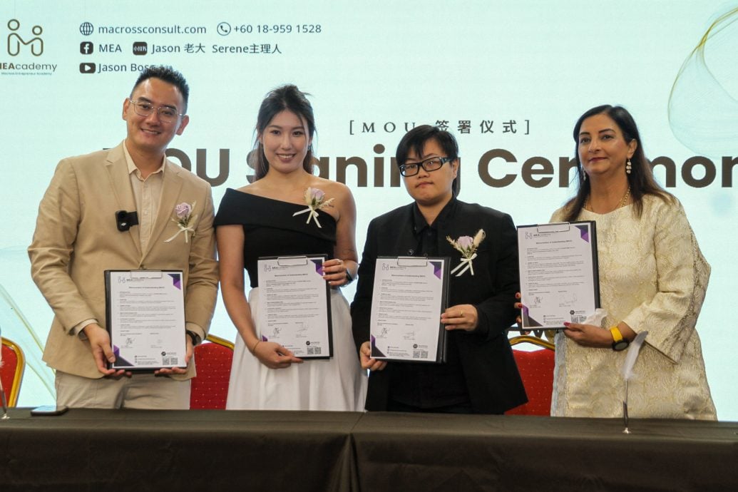 MEA在开幕典礼当天和多个单位签署合作备忘录,缔结友好关系、深化彼此间的合作。左一起是宋佳珈、南方大学学院校长蔡润煌教授、CPT培训发展私人有限公司董事经理林奕竣、Playday董事经理陈熊。
