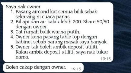 一名房屋仲介在脸书分享让人掉下巴的对话截图,内容是一名有意租屋者列出5大“霸王条件”,附加2项要求,包括要求若每月水电费超过200令吉,屋主须分担一半,让仲介忍不住在对话中建议对方“你不如自己买屋”!
