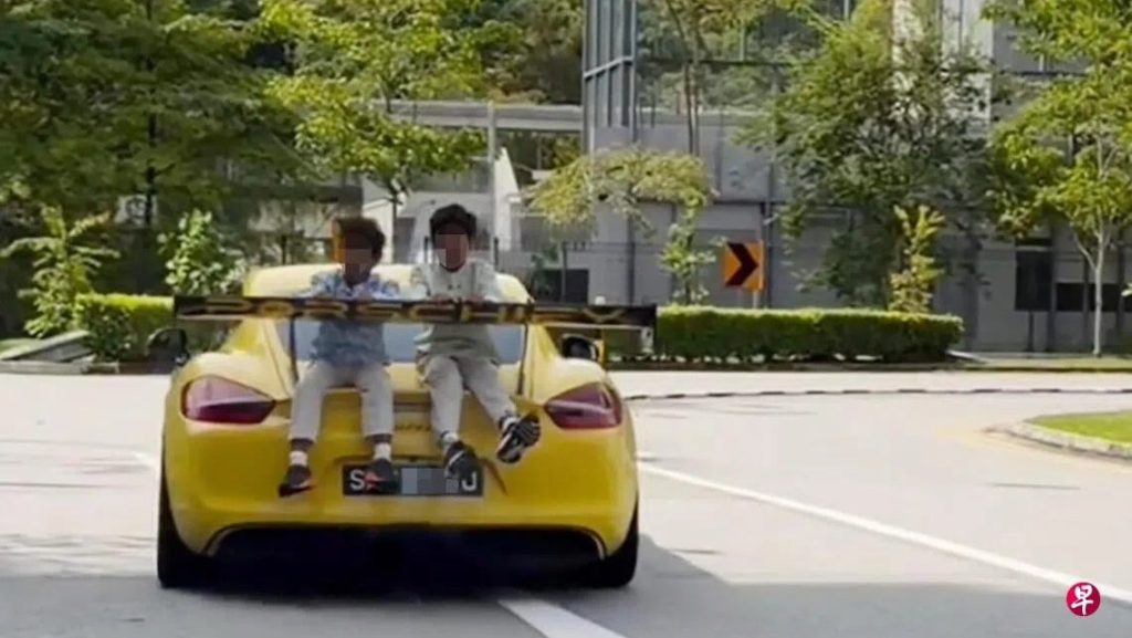 两名小孩危坐在行驶中的保时捷后车厢上,家长竟在一旁摄影,视频曝光后引发热议。