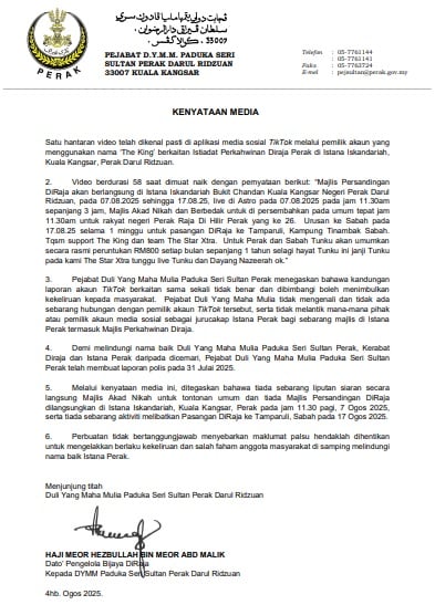 霹雳州苏丹办公室强调,社交媒体上流传一则关于霹雳州王家婚礼的影片内容完全不实,为了维护霹雳州苏丹、王室成员及王宫的名誉,霹雳州苏丹办公室已报警处理。