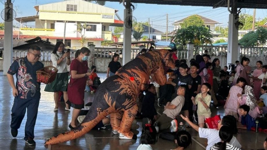 (古来17日讯)“恐龙”也来参加华小儿童节庆典! 泗隆华小昨天庆祝儿童节,上演了一场“惊喜大骚动”,一只“恐龙”来到校园,为逾200名学生送上欢乐。 这位“恐龙”是由董事长许良光特别扮演,他卸下平日的严肃形象,穿上充气恐龙服,上台表演舞蹈逗乐学生,并现场派发糖果,校园瞬间变成欢乐园。 许良光受访时笑言,这是他第三年在儿童节“变装”登场。 “前年我扮财神爷,去年是青蛙,今年换成恐龙!孩子们每年都期待我会穿什么,所以我也要绞尽脑汁制造惊喜。” 他说,去年的“青蛙”装扮深受欢迎,今年的“恐龙”装扮也吸引学生的开心笑容。 除了“恐龙派糖”环节,董事部与家教协会也准备了3辆脚踏车,作为幸运抽奖的大奖,掀起全场高潮。 视频:泗隆华小提供