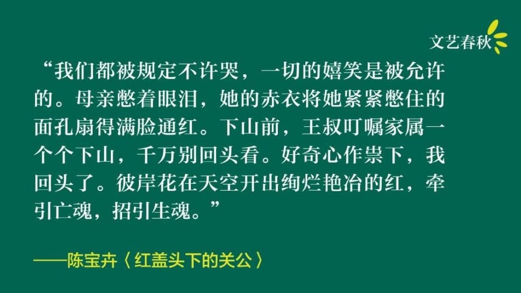 红点三三两两散布,这是何等吉利的喜事。早已置换好得以衬托此等大事的红衣,喜事的主人公波澜不惊,丝毫不见胸腔的起伏。 红盖头下的关公看不清神情。 吟唱着不知名的经文,祭拜天地的仪式完成了。启程时,一颠一颠的晃动仍未扰动主人公的清梦。我们是送亲的队伍,恭迎轿子先行一步,走出路口望见肯雅兰戏院的牌子,再步行至拐角处的恐龙公园,便坐上了车。驱离市区的远郊,湿粘的泥地,印着深浅不一的泥脚印。我们的腿脚深深地陷入,再用劲地拔起,循环反复,直至半山腰。蜿蜒向上的泥路,我们被裁剪成一块一块的红彩带,只在“欢欣雀跃”中落下,最终陷入深褐色的泥地里。 土坑早已挖好,那是人生到了下一阶段的长眠地。主人公已经不会醒了,我们都知道的。泥点一点点覆盖,直至成了一团冒尖的土堆。土坑内外统一的红色衣裳,真是天大的“喜庆”!着实该“祝贺”一番。喜的是喜丧;庆的是长眠;祝的是死亡;贺的是解脱。 我们都被规定不许哭,一切的嬉笑是被允许的。母亲憋着眼泪,她的赤衣将她紧紧憋住的面孔扇得满脸通红。下山前,王叔叮嘱家属一个个下山,千万别回头看。好奇心作祟下,我回头了。彼岸花在天空开出绚烂艳冶的红,牵引亡魂,招引生魂。 几年后某天的凌晨4点,大舅因肺积水去世。重复操办相似的丧事,而这次不同的是白替红。我们被允许哭泣和悲伤,再也不似初次外婆过世那般大摆筵席,张灯结彩,呼朋引友。相似的是,我们需要烧脚尾钱,将纸钱折成元宝的形状,在火盆里围成一个圈,一个接一个地不许断,直至出殡。亡魂需要脚尾钱的指引,作为通往阴间的过路费。 烧脚尾钱的时候,偶然听见大舅母说:“哎呀,我是他老婆,怎么能烧脚尾钱呢?”这句话听着耳熟,我好似几年前听过:“我是儿媳,怎么能烧脚尾钱呢?”这看似不像话的理由,却是有其理的,毕竟千百年来的古人早已说了:“夫妻本是同林鸟,大难临头各自飞”。我们作为中华文化传统的传承者,本该好好铭记于心才是。 无人接替,一整夜未合眼在烧脚尾钱的我,恍惚间听见被烈焰笼罩的前处空地传来的争执:“白金应该全部都是我的吧?我是周华的老婆。”仍躺在棺木里的我的大舅,叫周华。我依稀可见大舅母的头顶长出了角,瞳孔是竖起的椭圆形状。 大舅的儿子,四表哥接替了我的位置,我却无心补眠,静默折着烧脚尾钱需要的元宝。不承想,此时的好心,待会儿可有我后悔的了。晚间,大舅的友人前来祭奠,子女须在旁跪坐答礼。四表哥是大舅的儿子,正忙着烧脚尾钱,所幸大舅仍有一女,五表姐阿玲,可完成答礼仪式。 “阿玲!阿玲!”三表哥反复叫道。 无人应答。孙子辈排行第七,最小的小表弟说道:“她好像和男友在车里……”友人一直在大舅遗体前等待,因无人跪坐,他们就无法祭拜。四表哥让四表姐帮忙接替烧纸钱,他则黑沉着脸跪坐在旁。由此蹉跎入夜,晚间11点我困倦入睡了,想着昨夜一宿未眠,应有人轮班接替才是。 孤舟在溪流中央平静地流淌,倏地有条蛟龙不断撞击船的底部,船只剧烈摇晃,我亦在左右摇晃中掉入水里。掉入时想着:“吃了我它就能化龙了吧。”刺骨的冷意促使我睁眼,望见蛟龙凶恶的瞳仁,猛地惊醒。 “快醒醒!去烧脚尾钱!”大舅母如是命令道,瞪着细缝般的双眼,恍惚间可见竖起的瞳仁。果然是把我吞了,已然化龙般的颐指气使。 “我昨晚没睡,今晚该轮到五表姐了吧?”我瞅了眼身上的被子,早已不知所踪。 “她要睡觉,你起来烧就是了!”当时18岁的我怎么生不出反抗的意识呢?不作他想,笃定地认为是化龙后睥睨众生的气势震慑住了我。 嘟囔着从房间走到客厅:“啊早知道应该午睡的。”极度的困意和灼人的热度同袭,如同火盆中的火焰般气煞我也。我抬头盯着临时搭建的神桌,摆着大舅的黑白照,照片上浮现小学华文课时在诵读的《弟子规》:“弟子规,圣人训,首孝弟,次谨信,泛爱众,而亲仁,有余力,则学文……”刚要接着读“入则孝”,同学喊了我的名字说:“你的大舅又来送饭给你吃了,真好。”未曾低头,机械式地反复烧着脚尾钱,浑然不觉将手中的《弟子规》一股脑地给烧干净了。 母亲一夜好眠,早上7点接替了我。此时补觉已无可能,马上就要出殡了,于是想赶紧洗个澡驱赶附着在身上的热意。由蛟化龙的大舅母又出现了,她瞥见我要去洗澡,连忙拦住了我,命令道:“你先别洗,先让阿玲洗。” “她都还没起床,我先洗会怎样吗?”连着两夜未曾好眠,身上又带着刚烧完脚尾钱好似被烤焦的味道和滚烫的热意,语气逐渐不耐烦。 “总之,你先让阿玲洗!”说完她就去喊五表姐起床,我一如既往地遵从长辈的话语,发扬温良谦恭让的中华精神。精神恍惚的我在原地想着:不知何时轮到我化龙?但化龙就得吞人吧?可我着实吞不下去,也太血腥了些。不知大舅母是怎么忍心把我吞下去的?困意使我分不清现实和梦境,在胡思乱想中度过了等待五表姐起床、赖床、洗澡的时间。 洗了澡倒是驱散了身上的味道和热意,身上是清爽了,困意也越来越浓厚了。出殡前,家属要围着棺木绕一圈瞻仰遗容,绕了一圈就走到一旁站着,双手合十,旁有僧人不断诵经。等到出殡时,二姨在厨房和姐妹嫂嫂聊起大舅还仍在世的事情,盖上红盖头的关公虽看不见,但肯定也听见了亲属们对逝者的缅怀。 倏地,二姨的手机响了,来电显示是“周华”。她边哭边笑着说:“大哥打给我了!大