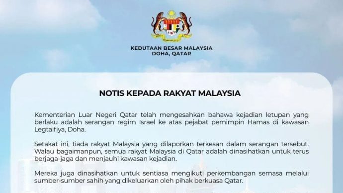 马来西亚驻多哈大使馆说,多哈莱格塔菲亚地区发生爆炸,卡塔尔外交部已确认这是以色列政权针对哈马斯领导人办公室的袭击事件,而目前并无大马公民在事件中受影响。