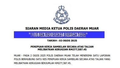 彭亨总警长拿督斯里耶哈也透过文告指出,彭亨州商业罪案调查组接获来自关丹县的一宗投报,指称一名受害者坠入不存在的兼职工作诈骗,而蒙受29万9646令吉损失。