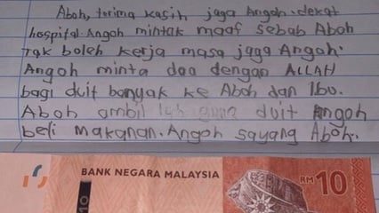 一名患病的小男孩手写了一张纸条给父亲,字里行间向父亲表达感激之情,感动了许多网民。