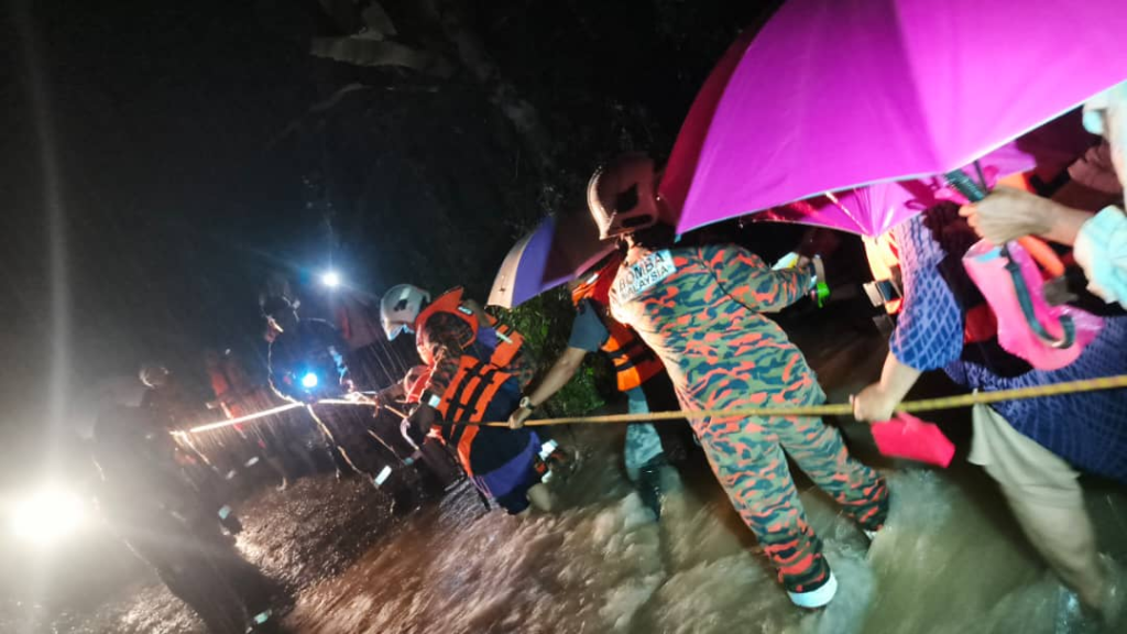 暴雨导致河水泛滥,吉北樟仑甘榜旺比拉一家八口受困在果园内,历经了惊险时刻,所幸消拯员及时赶到,将他们平安救出。