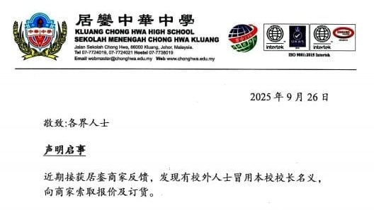 再有人冒用銮中名义企图行骗,这次是冒用居銮中华中学校长名义,试图向商家索取报价及订货,民众切勿上当。
