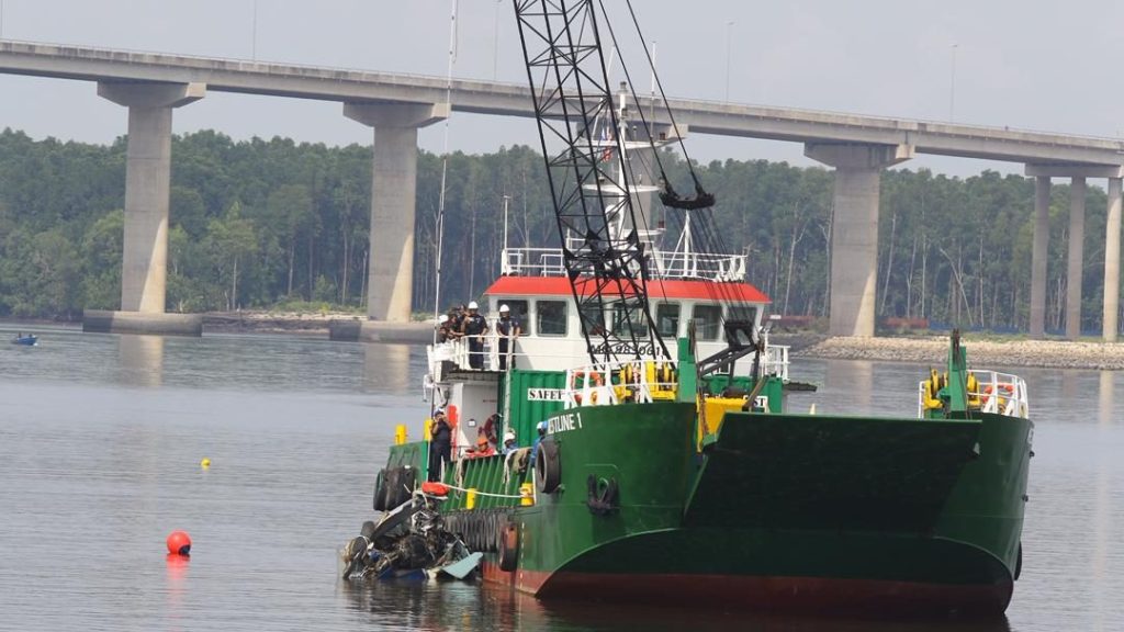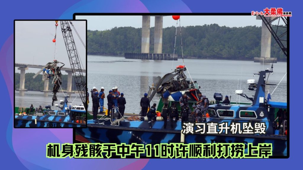 大柔佛三分钟 | 演习直升机坠毁| 机身残骸于中午11时许顺利打捞上岸